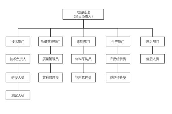 我司针对此项目设置的质量管理组织从部门划分上主要分为技术部门、质量管理部门、采购部门、生产部门、售后部门,具体如下图所示: